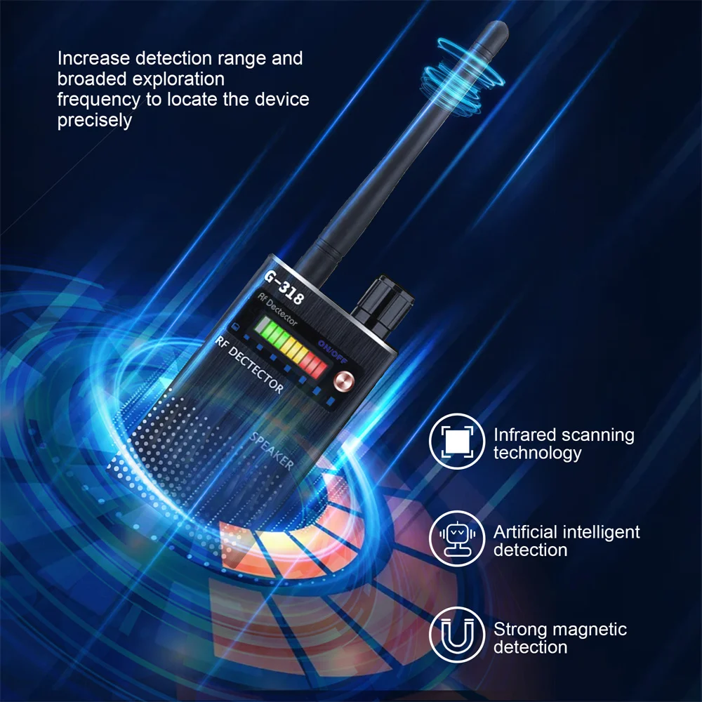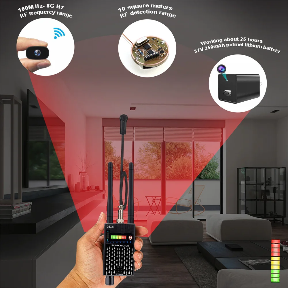 تم تجهيز كاشف الكاميرات المخفية بزوج من الهوائيات لتعزيز الأداء. تم تصميمه لحماية الخصوصية الشخصية من خلال تحديد كاميرات Wi-Fi المخفية، أجهزة تنصت الهواتف المحمولة، أجهزة تتبع GPS، وأجهزة التنصت الصوتي اللاسلكية. حجمه الصغير يجعله سهل الحمل في أي مكان، سواء كنت مسافرًا، تتحقق في فندق، أو في مكتب.