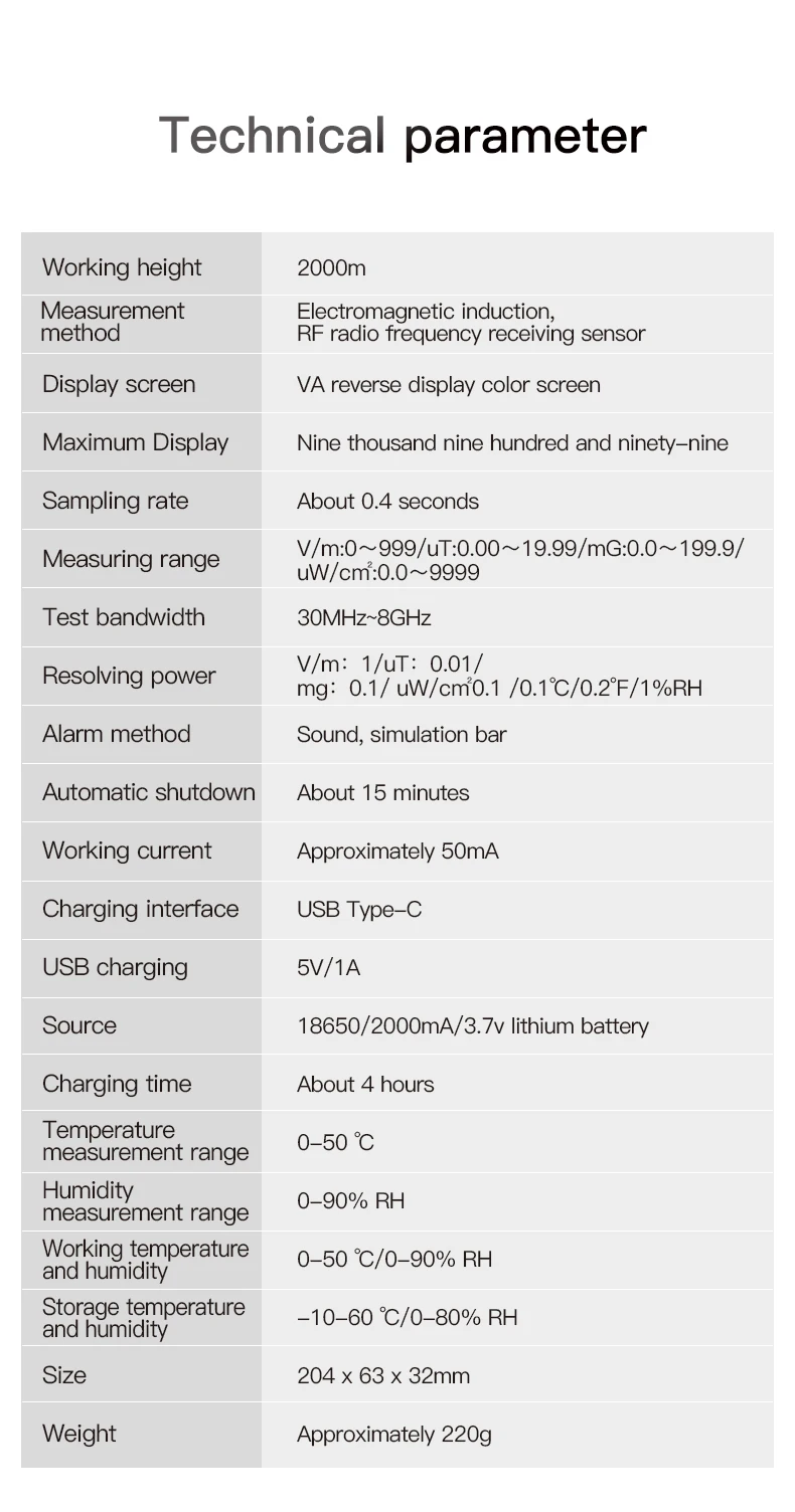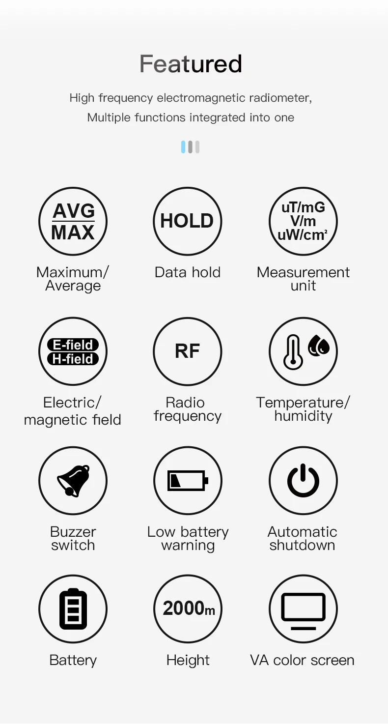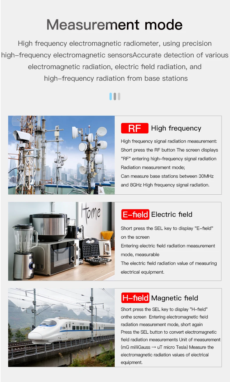 جهاز قياس الإشعاع الكهرومغناطيسي عالي التردد، يستخدم حساسات كهرومغناطيسية عالية التردد دقيقة. للكشف الدقيق عن مختلف أشكال الإشعاع الكهرومغناطيسي، وإشعاع الحقل الكهربائي، والإشعاع عالي التردد من محطات القاعدة.
