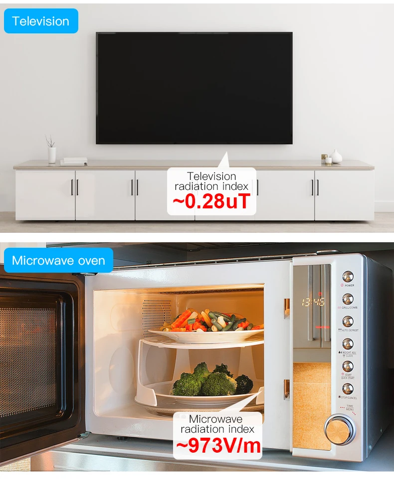 في بيئات الحياة اليومية، تأتي مصادر الإشعاع من أجهزة الكمبيوتر، والتلفزيونات، والميكروويف، والمراوح الكهربائية، والأجهزة المنزلية مثل الهواتف المحمولة.