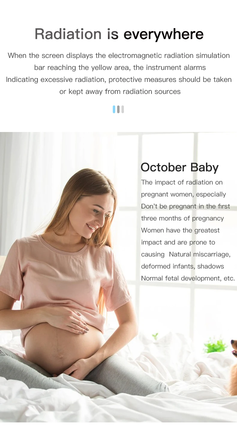 عندما يعرض الشاشة شريط محاكاة الإشعاع الكهرومغناطيسي يصل إلى المنطقة الصفراء، يصدر الجهاز إنذارًا يشير إلى وجود إشعاع مفرط، وينبغي اتخاذ تدابير وقائية أو الابتعاد عن مصادر الإشعاع.